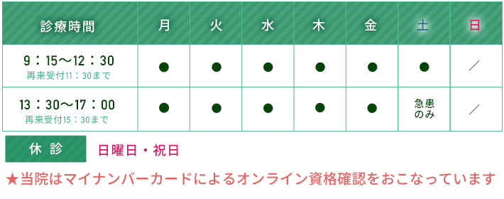 当院は、より質の高い診療を行うため、オンライン資格確認により情報(受信歴、薬剤情報、特定健診情報、その他必要な診療情報)を取得して活用しています。初診時にはマイナンバーカードをご持参ください。